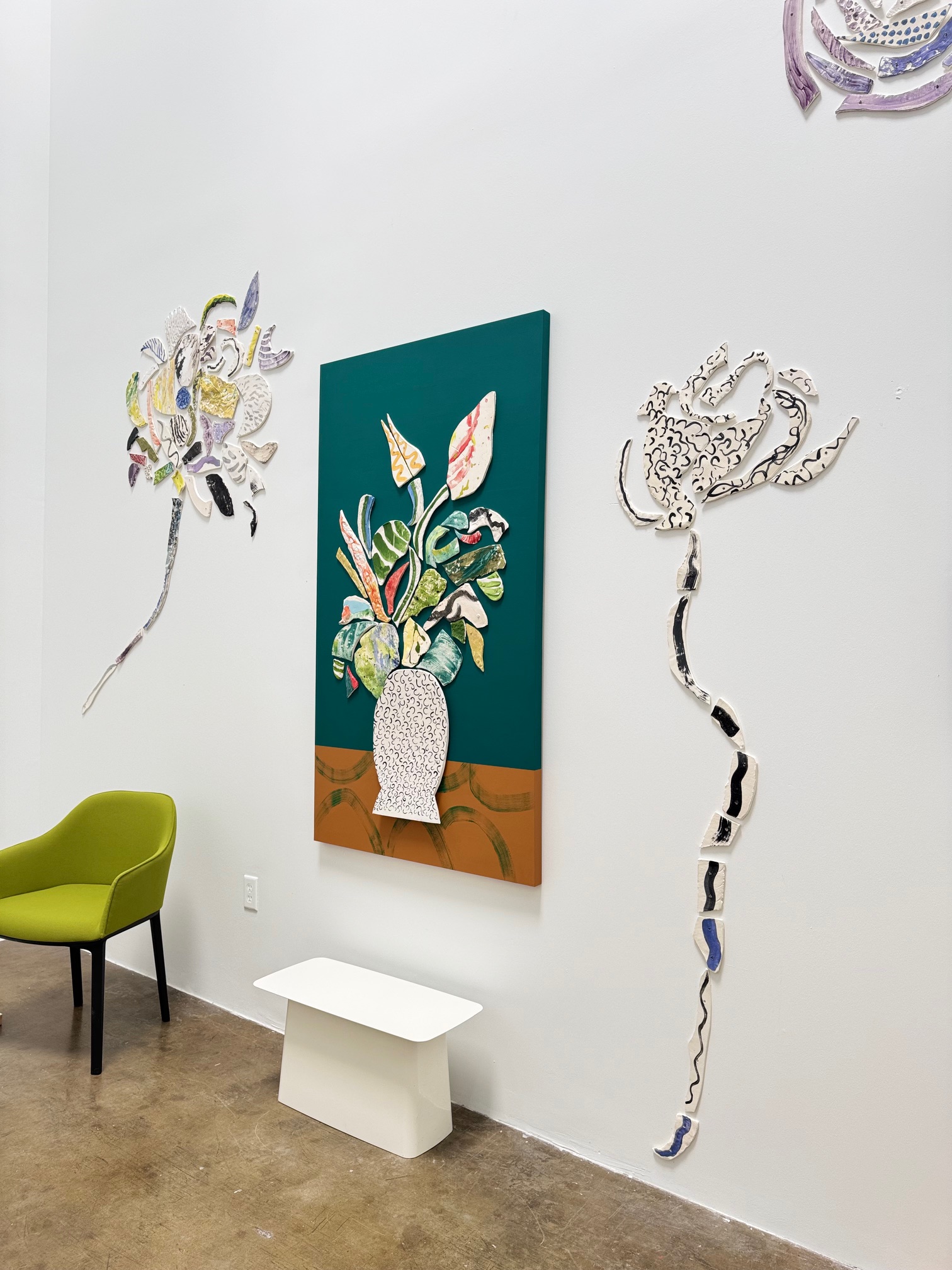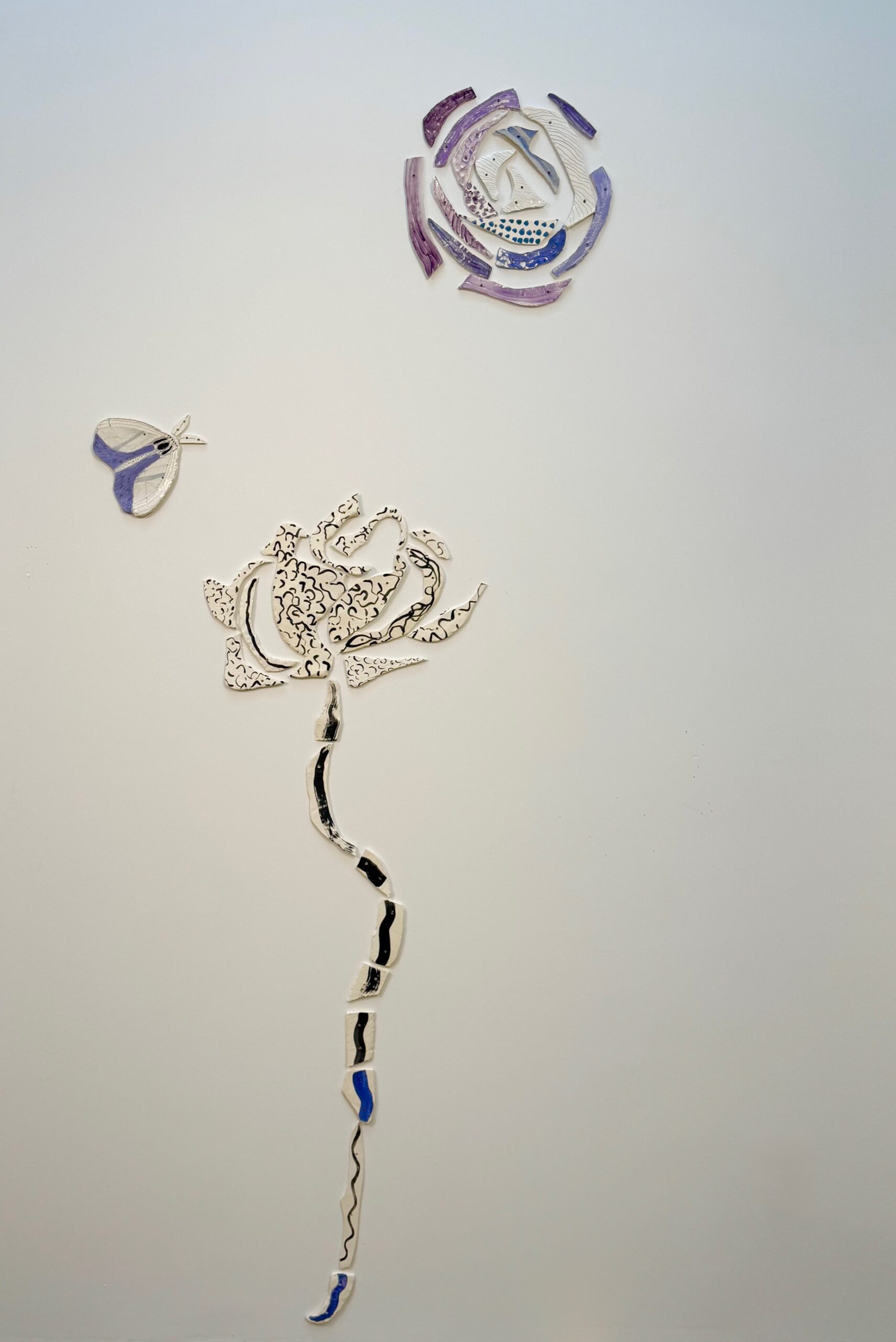 Acrylic, crayon, pastel, watercolor pencil, pencil & molding paste on canvas | 25 glazed & fired ceramic wall installation